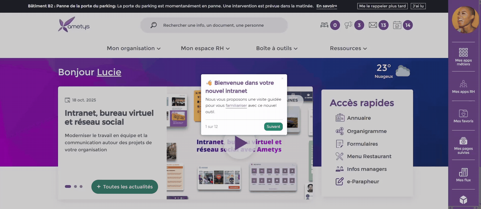 Pour lever les appréhensions des premiers jours, rien ne fonctionne mieux qu’un guide dès la première connexion.Le Welcome Tour intégré dans Ametys joue exactement ce rôle : une courte visite guidée qui présente les fonctionnalités essentielles et aide les agents à comprendre rapidement comment naviguer. Simple, interactif et non intrusif, il rassure et installe les bons réflexes dès le départ.